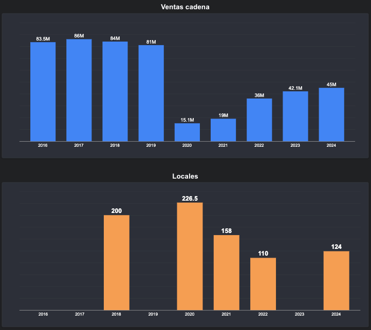 La venta por local es muy parecida (380k ahora vs 420k en 2018). También podría ser que hayan priorizado quedarse con locales más pequeños, afectando a la venta media.